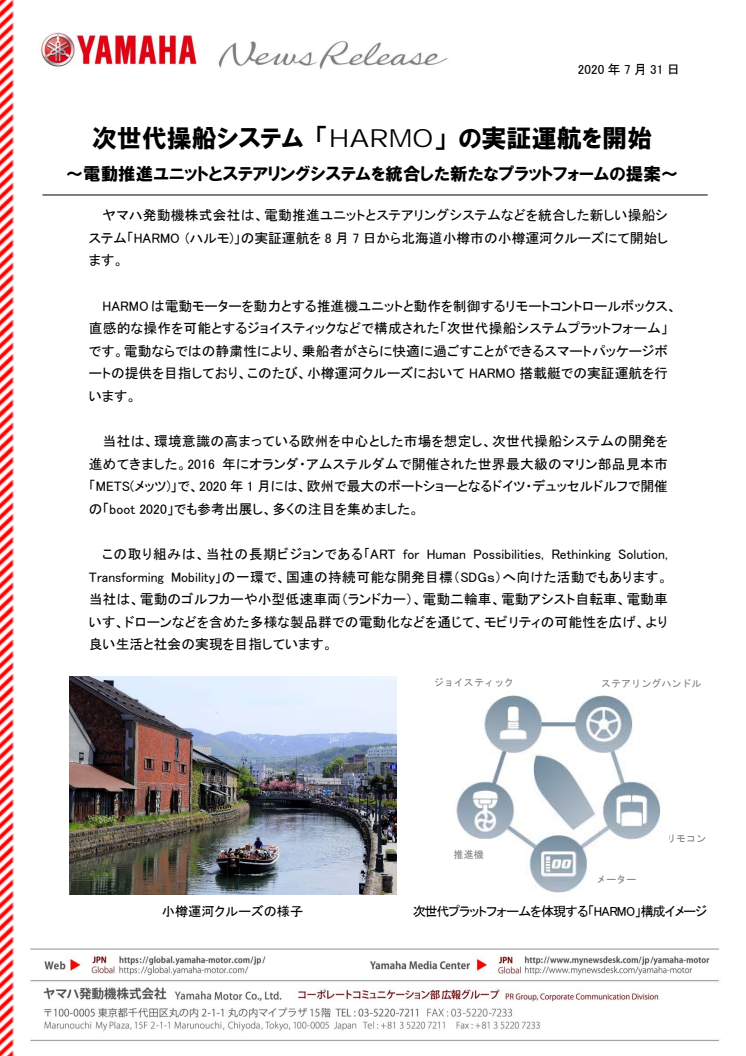 ヤマハ発動機株式会社は、電動推進ユニットとステアリングシステムなどを統合した新しい操船システム「HARMO (ハルモ)」の実証運航を8月7日から北海道小樽市の小樽運河クルーズにて開始します。