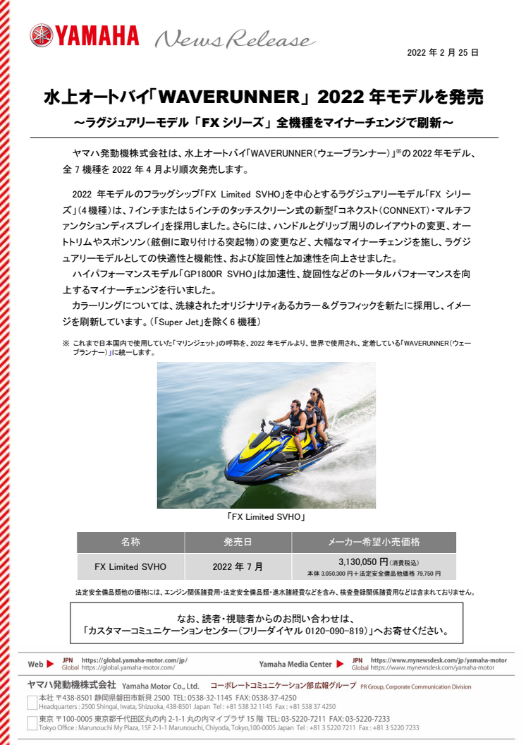 水上オートバイ「WAVERUNNER」 2022年モデルを発売 ~ラグジュアリーモデル 「FXシリーズ」 全機種をマイナーチェンジで刷新~