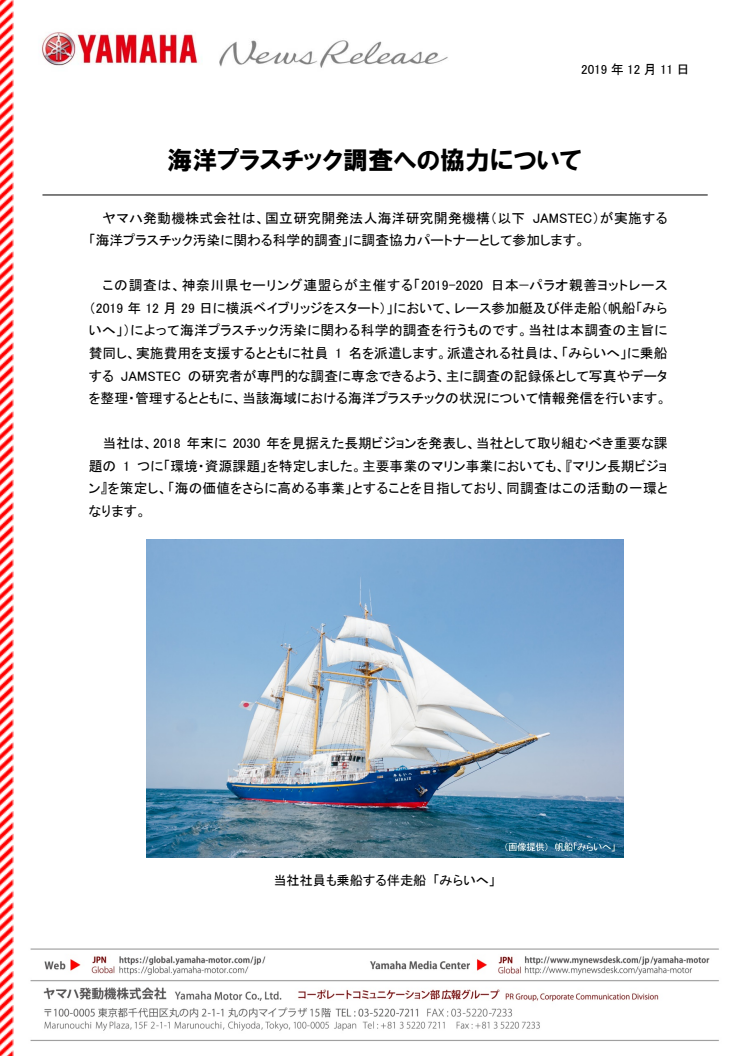 ヤマハ発動機株式会社は、国立研究開発法人海洋研究開発機構(以下 JAMSTEC)が実施する「海洋プラスチック汚染に関わる科学的調査」に調査協力パートナーとして参加します。
