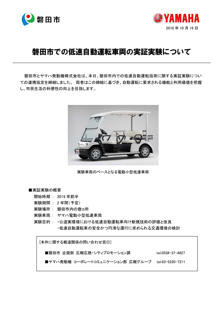 磐田市とヤマハ発動機株式会社は、本日、磐田市内での低速自動運転技術に関する実証実験についての連携協定を締結しました。 両者はこの締結に基づき、自動運転に要求される機能と利用価値を把握し、市民生活の利便性の向上を目指します。