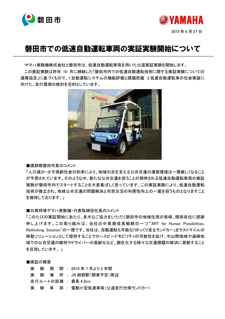 ヤマハ発動機株式会社と磐田市は、低速自動運転車両を用いた公道実証実験を開始します。