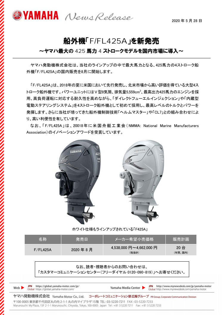 ヤマハ発動機株式会社は、当社のラインアップの中で最大馬力となる、425馬力の4ストローク船外機「F/FL425A」の国内販売を8月に開始します。