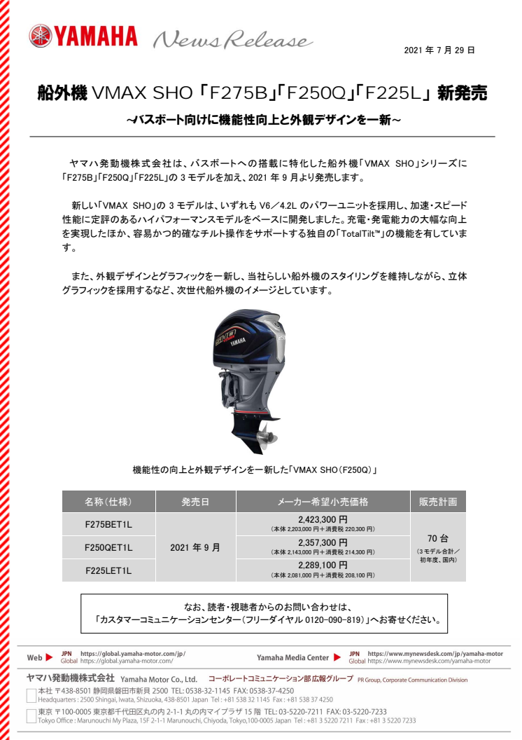 ヤマハ発動機株式会社は、バスボートへの搭載に特化した船外機「VMAX SHO」シリーズに「F275B」「F250Q」「F225L」の3モデルを加え、2021年9月より発売します。