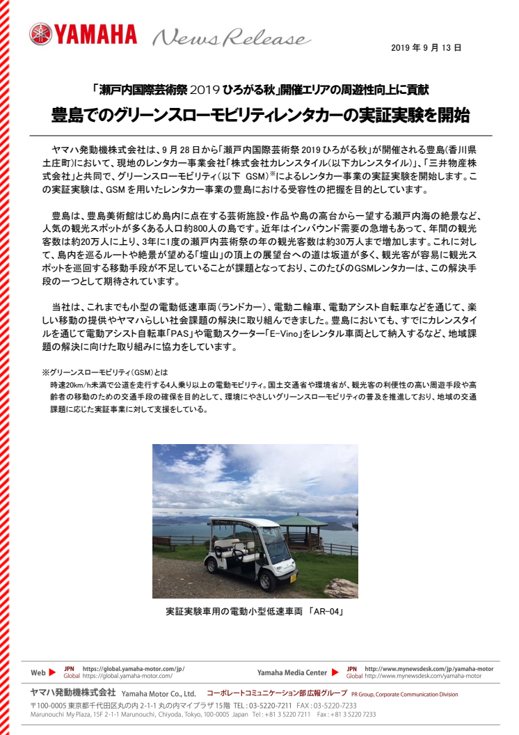 ヤマハ発動機株式会社は、9月28日から「瀬戸内国際芸術祭2019ひろがる秋」が開催される豊島(香川県土庄町)において、現地のレンタカー事業会社「株式会社カレンスタイル(以下カレンスタイル)」、「三井物産株式会社」と共同で、グリーンスローモビリティ(以下GSM)※によるレンタカー事業の実証実験を開始します。この実証実験は、GSMを用いたレンタカー事業の豊島における受容性の把握を目的としています。