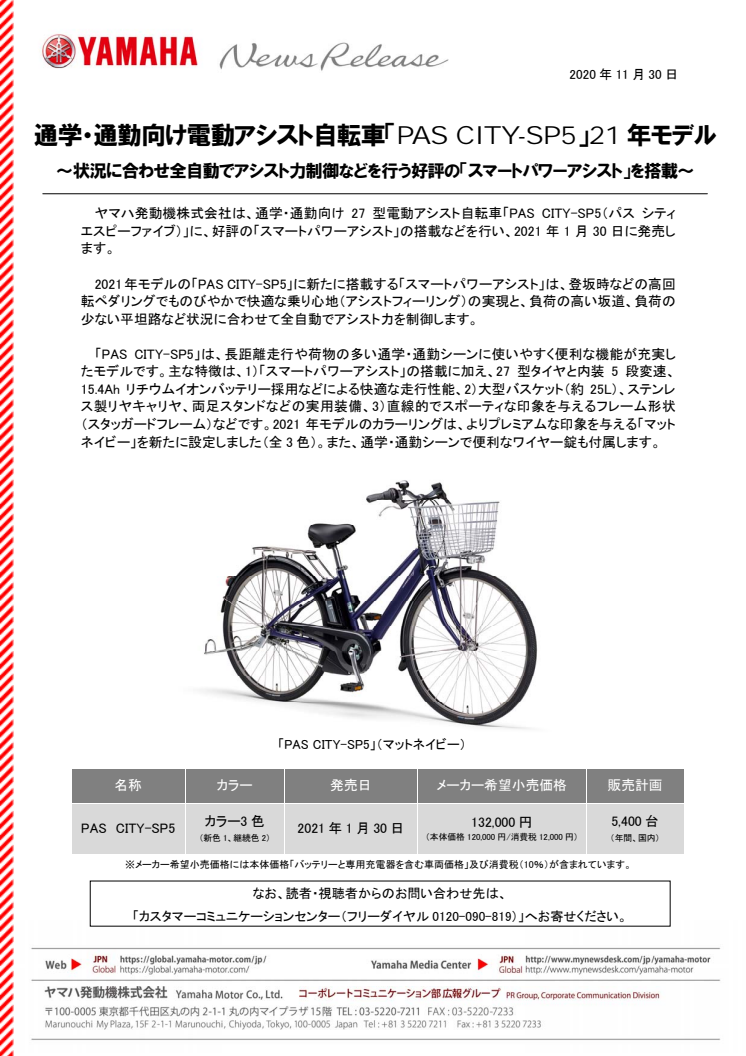 ヤマハ発動機株式会社は、通学・通勤向け27型電動アシスト自転車「PAS CITY-SP5(パス シティ エスピーファイブ)」に、好評の「スマートパワーアシスト」の搭載などを行い、2021年1月30日に発売します。