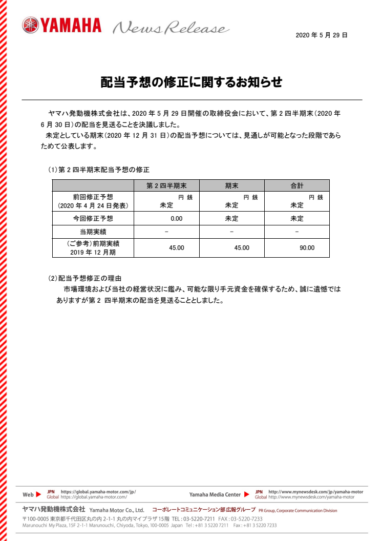 ヤマハ発動機株式会社は、2020年5月29日開催の取締役会において、第2四半期末(2020年6月30日)の配当を見送ることを決議しました。