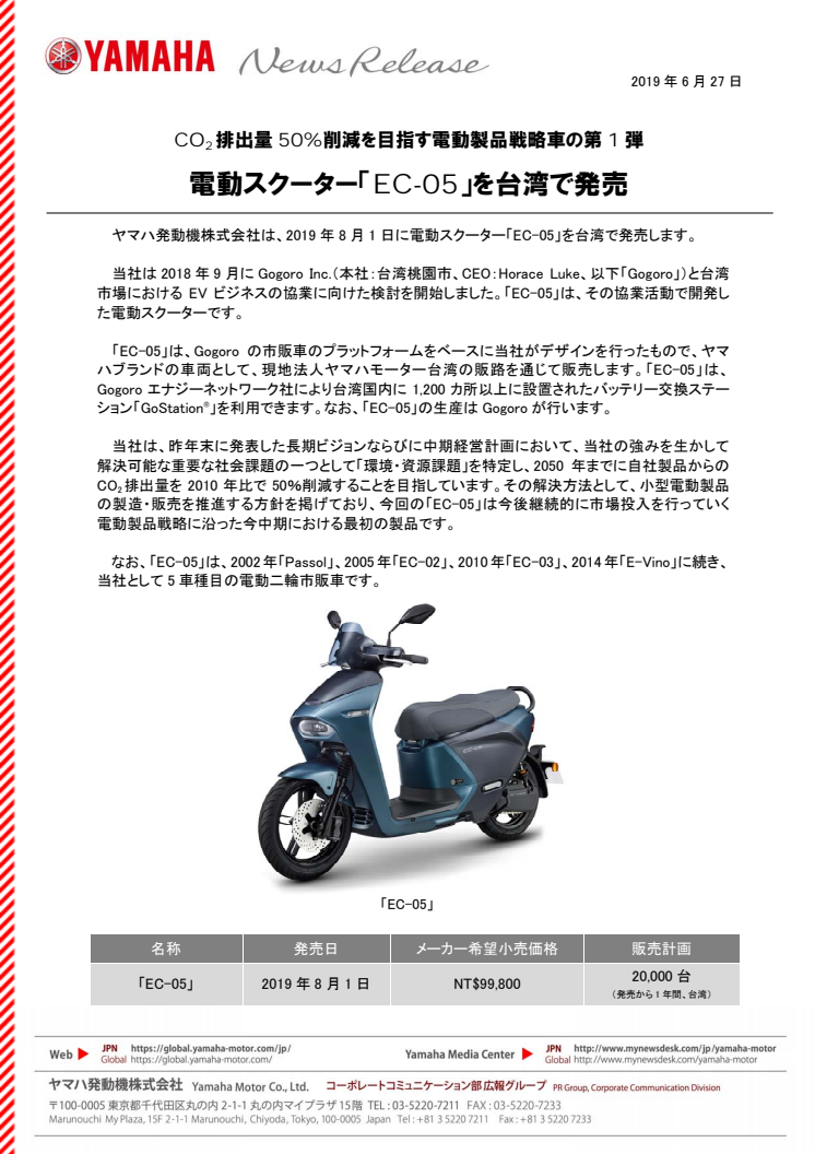 ヤマハ発動機株式会社は、2019年8月1日に電動スクーター「EC-05」を台湾で発売します。