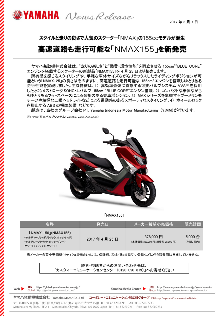 ヤマハ発動機株式会社は、“走りの楽しさ”と“燃費・環境性能”を両立させる155cm3“BLUE CORE”エンジンを搭載するスクーターの新製品「NMAX155」を4月25日より発売します。