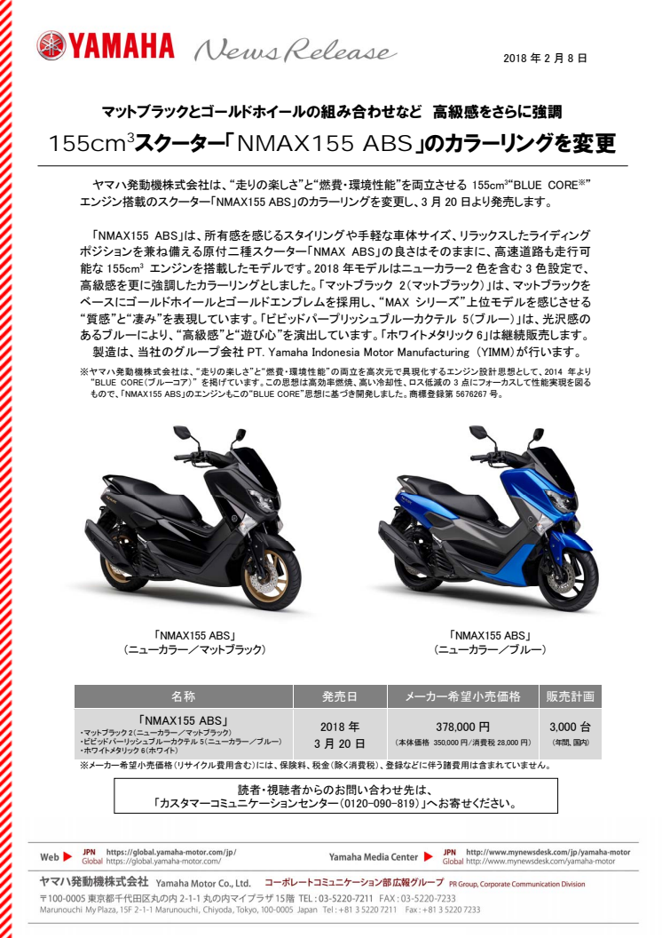 ヤマハ発動機株式会社は、“走りの楽しさ”と“燃費・環境性能”を両立させる155cm 3“BLUE CORE※”エンジン搭載のスクーター「NMAX155 ABS」のカラーリングを変更し、3月20日より発売します。