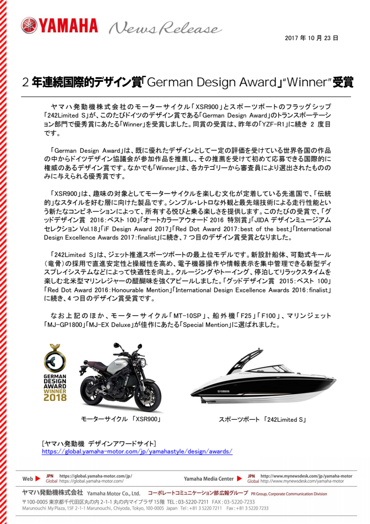 ヤマハ発動機株式会社のモーターサイクル「XSR900」とスポーツボートのフラッグシップ「242Limited S」が、このたびドイツのデザイン賞である「German Design Award」のトランスポーテーション部門で優秀賞にあたる「Winner」を受賞しました。同賞の受賞は、昨年の「YZF-R1」に続き2度目です。