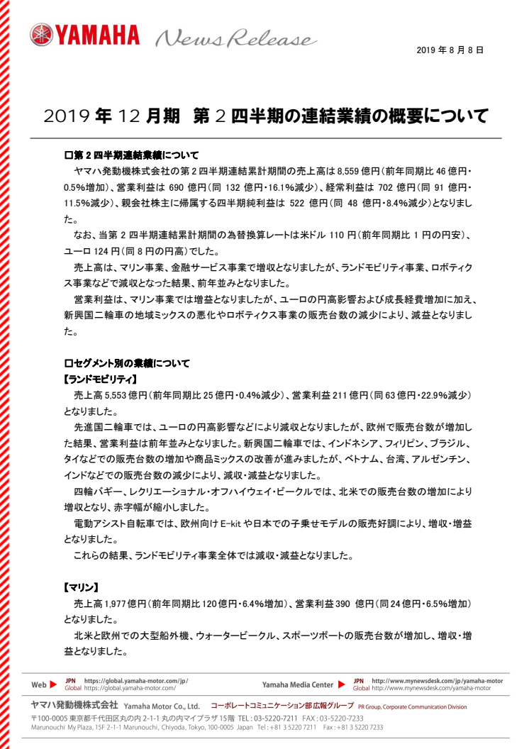 2019年12月期の通期連結業績予想につきましては、米中貿易摩擦の影響によるロボティクス事業の販売不振、および新興国二輪車でのベトナムの販売台数の減少や台湾のモデルミックス悪化により、当初予想を下回る見通しから、売上高・各利益を以下のとおり修正します。