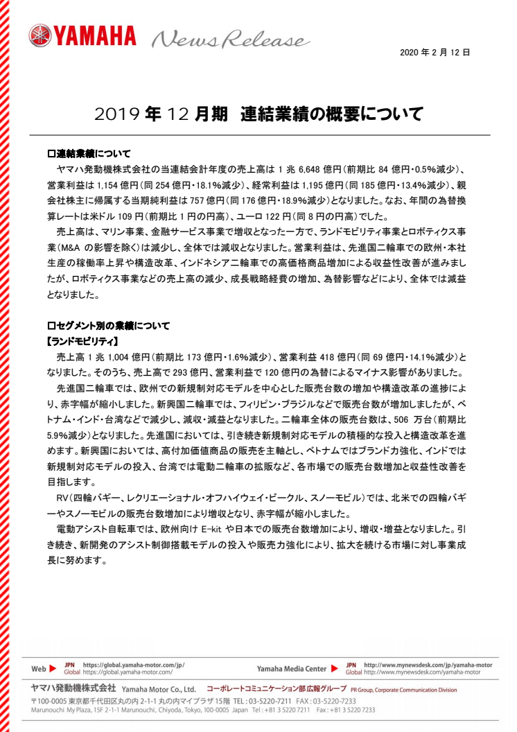ヤマハ発動機株式会社の当連結会計年度の売上高は1兆6,648億円(前期比84億円・0.5%減少)、営業利益は1,154億円(同254億円・18.1%減少)、経常利益は1,195億円(同185億円・13.4%減少)、親会社株主に帰属する当期純利益は757億円(同176億円・18.9%減少)となりました。なお、年間の為替換算レートは米ドル109円(前期比1円の円高)、ユーロ122円(同8円の円高)でした。