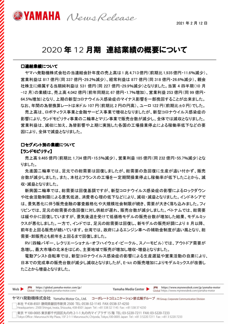 ヤマハ発動機株式会社の当連結会計年度の売上高は1兆4,713億円(前期比1,935億円・11.6%減少)、営業利益は817億円(同337億円・29.2%減少)、経常利益は877億円(同318億円・26.6%減少)、親会社株主に帰属する当期純利益は531億円(同227億円・29.9%減少)となりました。当第4四半期(10月-12月)の業績は、売上高4,042億円(前年同期比67億円・1.7%増加)、営業利益253億円(同99億円・64.5%増加)となり、上期の新型コロナウイルス感染症のマイナス影響を一部挽回することが出来ました。なお、年間の為替換算レートは米ドル107円(前期比2円の円高)、ユーロ122円(前期比±0円)でした。