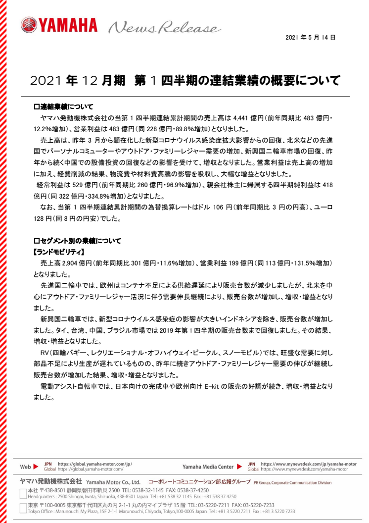 ヤマハ発動機株式会社の当第1四半期連結累計期間の売上高は4,441億円(前年同期比483億円・12.2%増加)、営業利益は483億円(同228億円・89.8%増加)となりました。