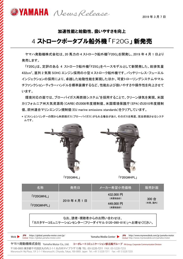 ヤマハ発動機株式会社は、20馬力の4ストローク船外機「F20G」を開発し、2019年4月1日より発売します。