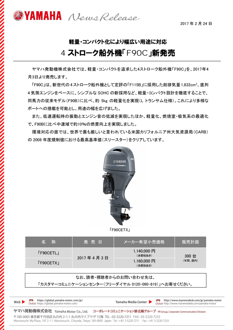 ヤマハ発動機株式会社では、軽量・コンパクトを追求した4ストローク船外機「F90C」を、2017年4月3日より発売します。