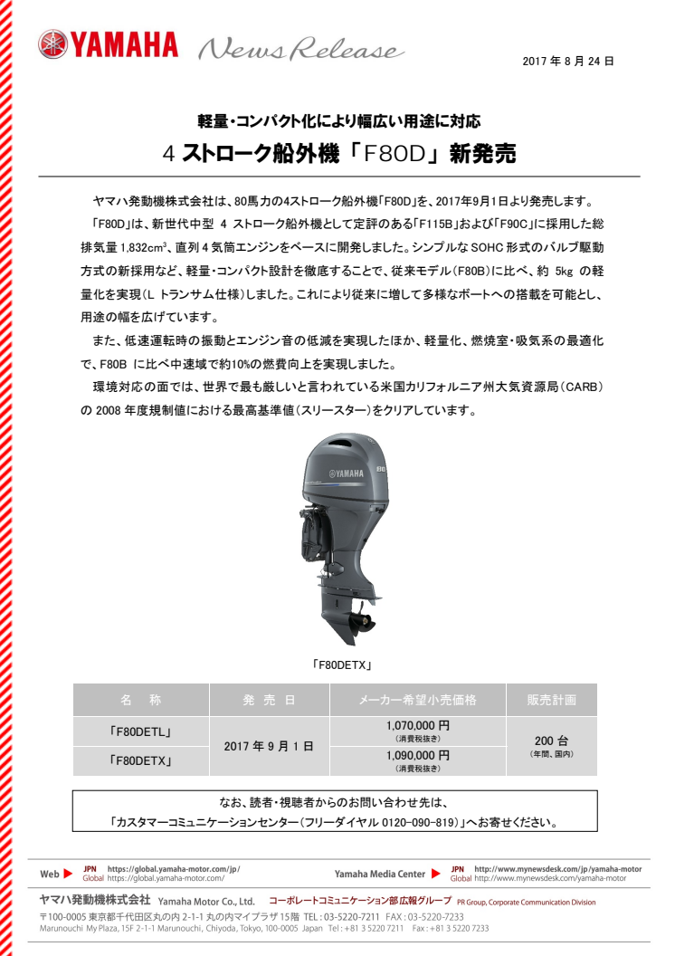 ヤマハ発動機株式会社は、80馬力の4ストローク船外機「F80D」を、2017年9月1日より発売します。