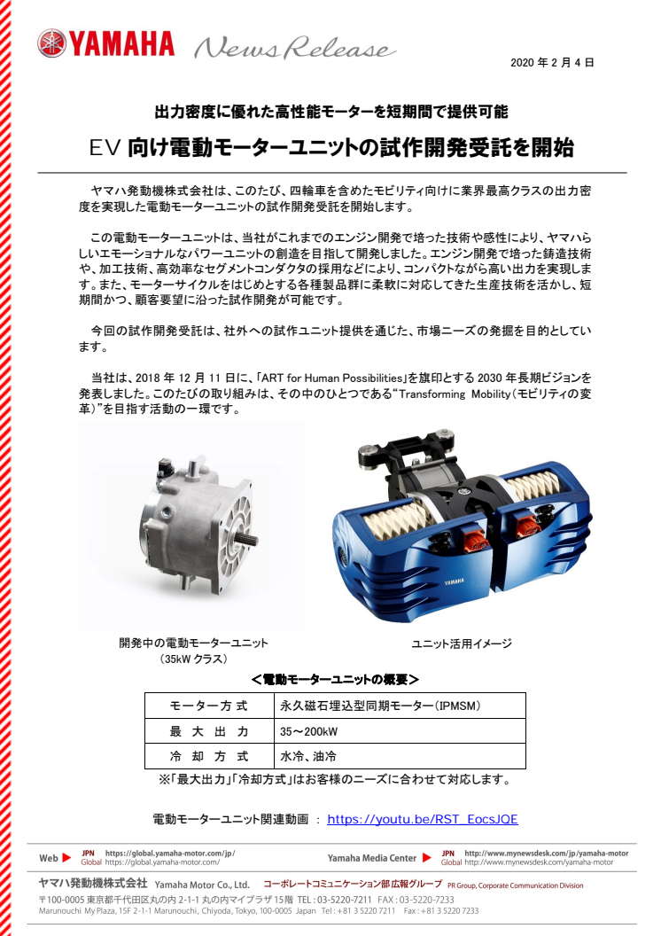 ヤマハ発動機株式会社は、このたび、四輪車を含めたモビリティ向けに業界最高クラスの出力密度を実現した電動モーターユニットの試作開発受託を開始します。