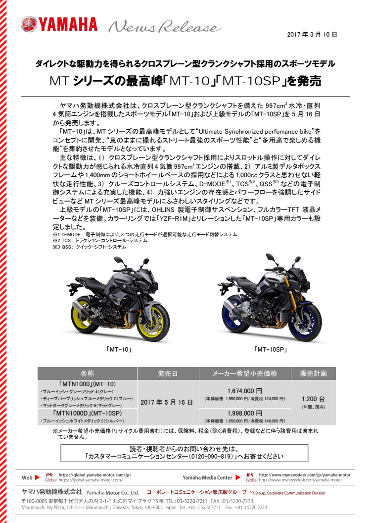MTシリーズの最高峰「MT-10」「MT-10SP」を発売 ダイレクトな駆動力を得られるクロスプレーン型クランクシャフト採用のスポーツモデル