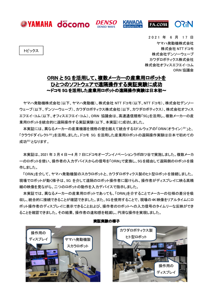 ヤマハ発動機株式会社(以下、ヤマハ発動機)、株式会社NTTドコモ(以下、NTTドコモ)、株式会社デンソーウェーブ(以下、デンソーウェーブ)、カワダロボティクス株式会社(以下、カワダロボティクス)、株式会社オフィスエフエイ・コム(以下、オフィスエフエイ・コム)、ORiN協議会は、高速通信規格「5G」を活用し、複数メーカーの産業用ロボットを統合的に遠隔操作する実証実験(以下、本実証)に成功しました。