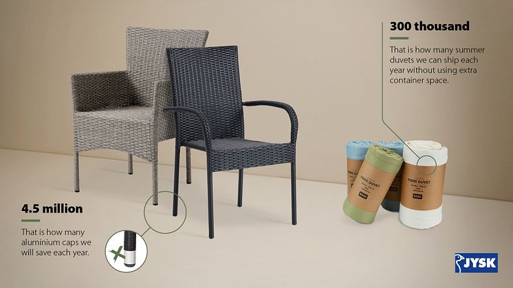 This spring, JYSK is implementing new production and packaging initiatives that reduce the use of aluminium by 22 tonnes and the needed freight space equivalent of 40 shipping containers annually.