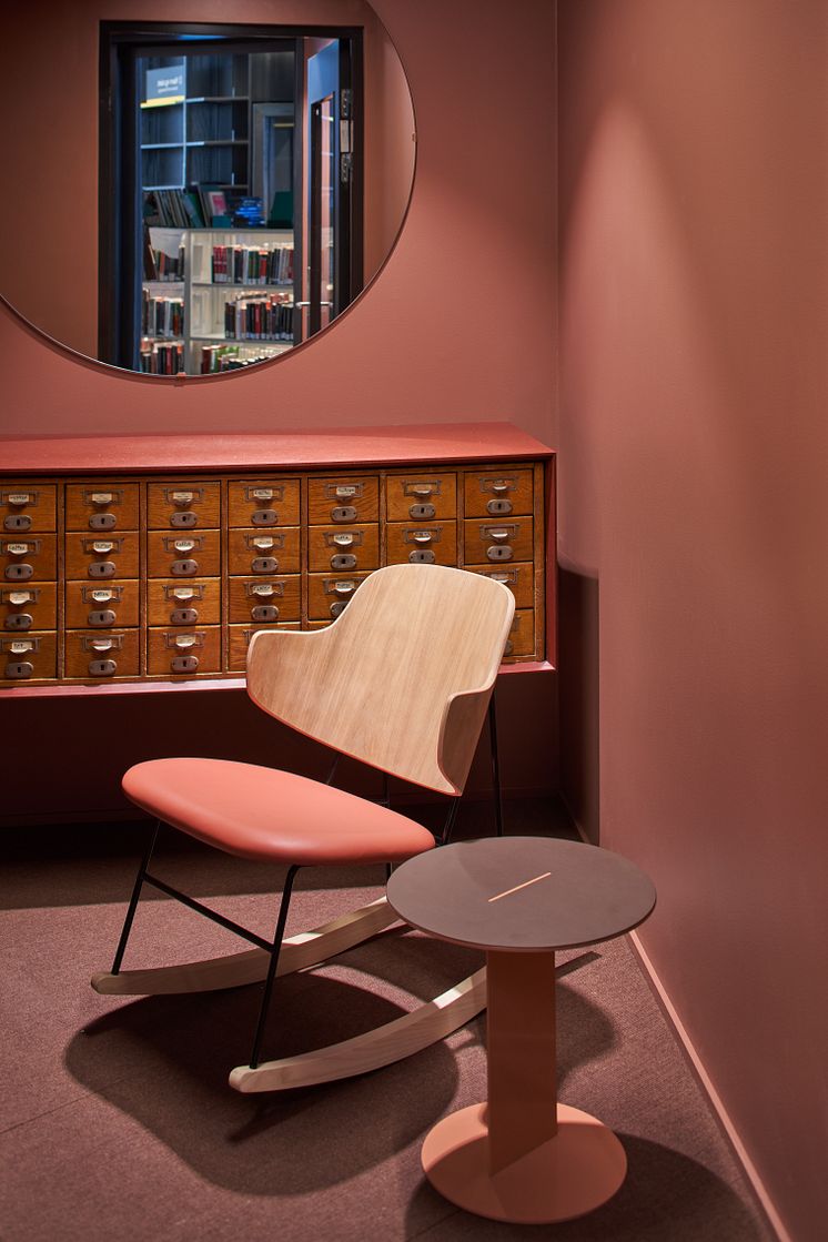 Reuse of the old library directory cabinets in one of the telephone rooms in Deichman Bjørvika.