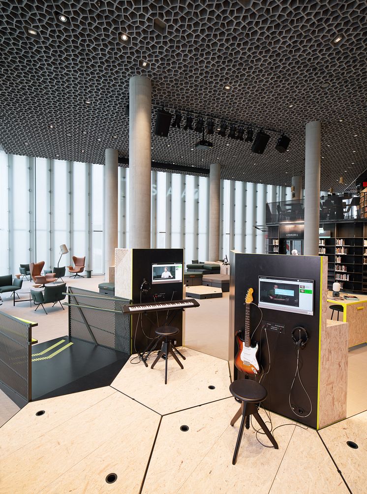 On the 4th floor you can learn to play a new instrument at our music stations.