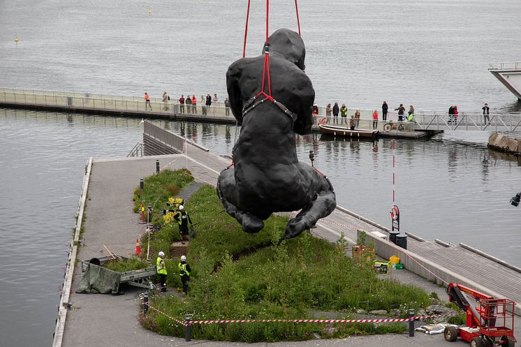 The sculpture is being lifted over to Inger Munchs pier in front of the MUNCH museum.