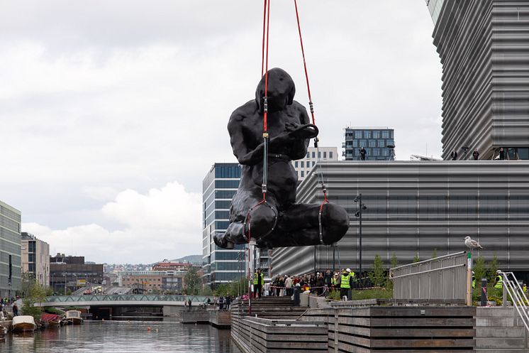 The sculpture is being lifted over to Inger Munchs pier in front of the MUNCH museum.