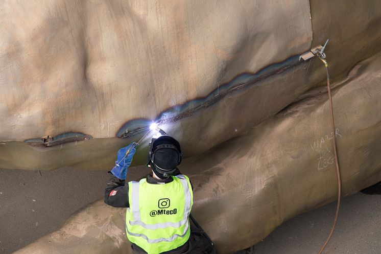The sculpture arrived to Oslo in five parts. Here the joints are welded together, March 2022.