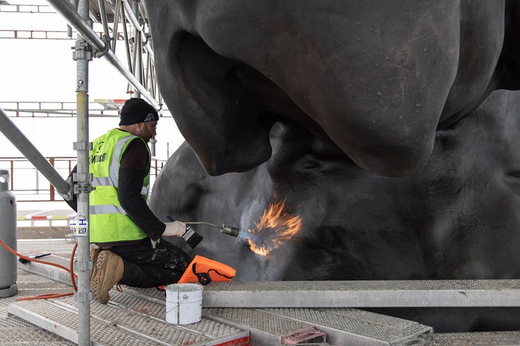 Warm waxing of The Mother inside the scaffolding at Sukkerbiten in Oslo.
