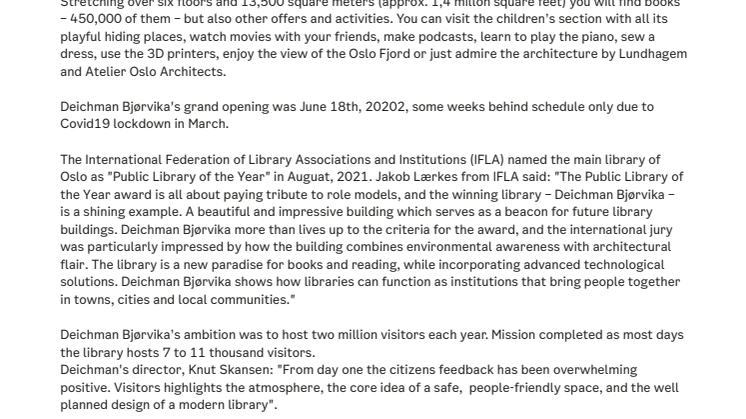 The library of the future - the IFLA Public Library of the Year 2021 - has received standing ovations since the opening (June 2020). Located between Oslo Central Station and the Oslo Opera House, Deichman Bjørvika is an extension of the 237 year history of the public library of Oslo. It also offer an exploration of what a library can be.