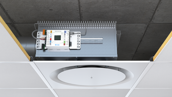 The unit is easy to install, the room regulator is attached to the box itself and room sensors are discrete placed in the diffuser part. It comes assembled, wired up and ready to install with all that is needed for a good and well-functioning DCV room solution for a pleasant indoor climate environment. The pre-assembled unit is delivered fully tested and reduces the risk of potential errors and ease up the total installation time.
