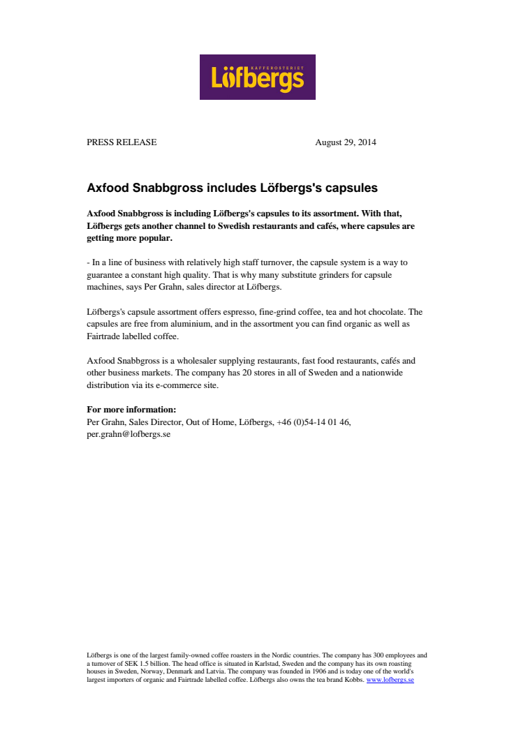Axfood Snabbgross is including Löfbergs's capsules to its assortment. With that, Löfbergs gets another channel to Swedish restaurants and cafés, where capsules are getting more popular.