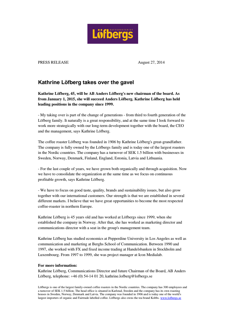 Kathrine Löfberg, 45, will be AB Anders Löfberg's new chairman of the board. As from January 1, 2015, she will succeed Anders Löfberg. Kathrine Löfberg has held leading positions in the company since 1999.