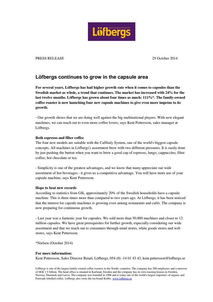 For several years, Löfbergs has had higher growth rate when it comes to capsules than the Swedish market as whole, a trend that continues. The market has increased with 24% for the last twelve months. Löfbergs has grown about four times as much: 111%*. The family-owned coffee roaster is now launching four new capsule machines to give even more impetus to its growth.