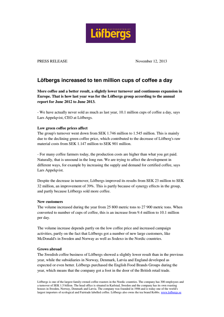 More coffee and a better result, a slightly lower turnover and continuous expansion in Europe. That is how last year was for the Löfbergs group according to the annual report for June 2012 to June 2013.