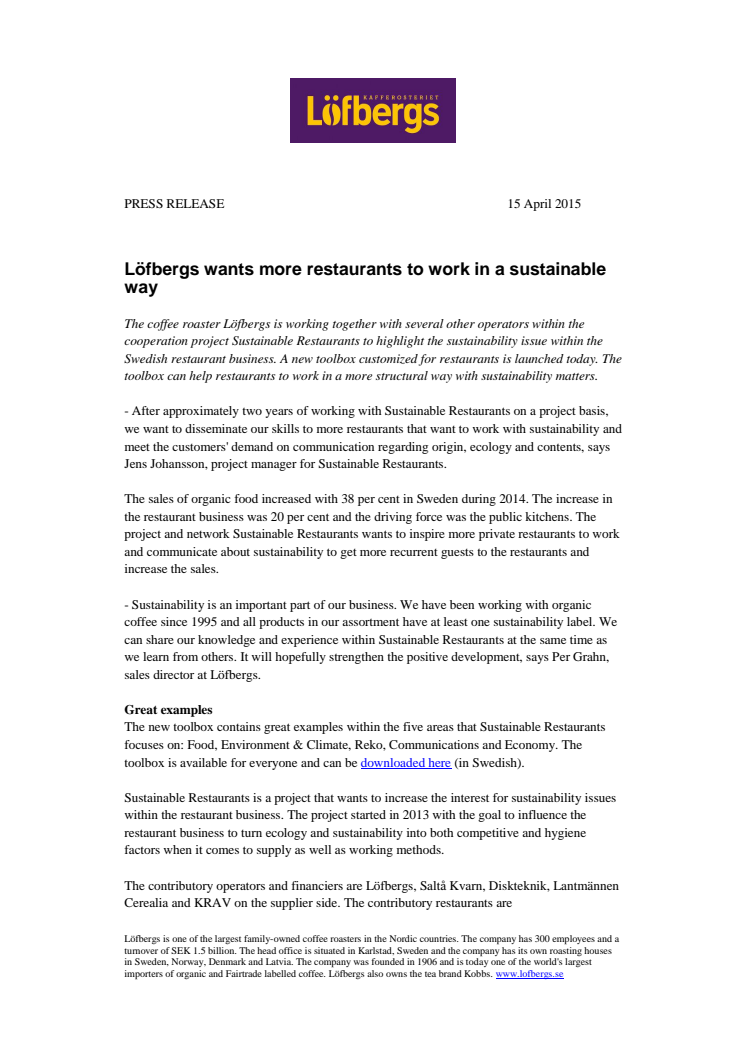 The coffee roaster Löfbergs is working together with several other operators within the cooperation project Sustainable Restaurants to highlight the sustainability issue within the Swedish restaurant business. A new toolbox customized for restaurants is launched today. The toolbox can help restaurants to work in a more structural way with sustainability matters.