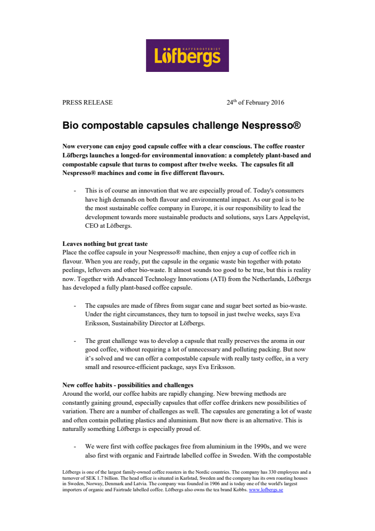 Now everyone can enjoy good capsule coffee with a clear conscious. The coffee roaster Löfbergs launches a longed-for environmental innovation: a completely plant-based and compostable capsule that turns to compost after twelve weeks.The capsules fit all Nespresso® machines and come in five different flavours.