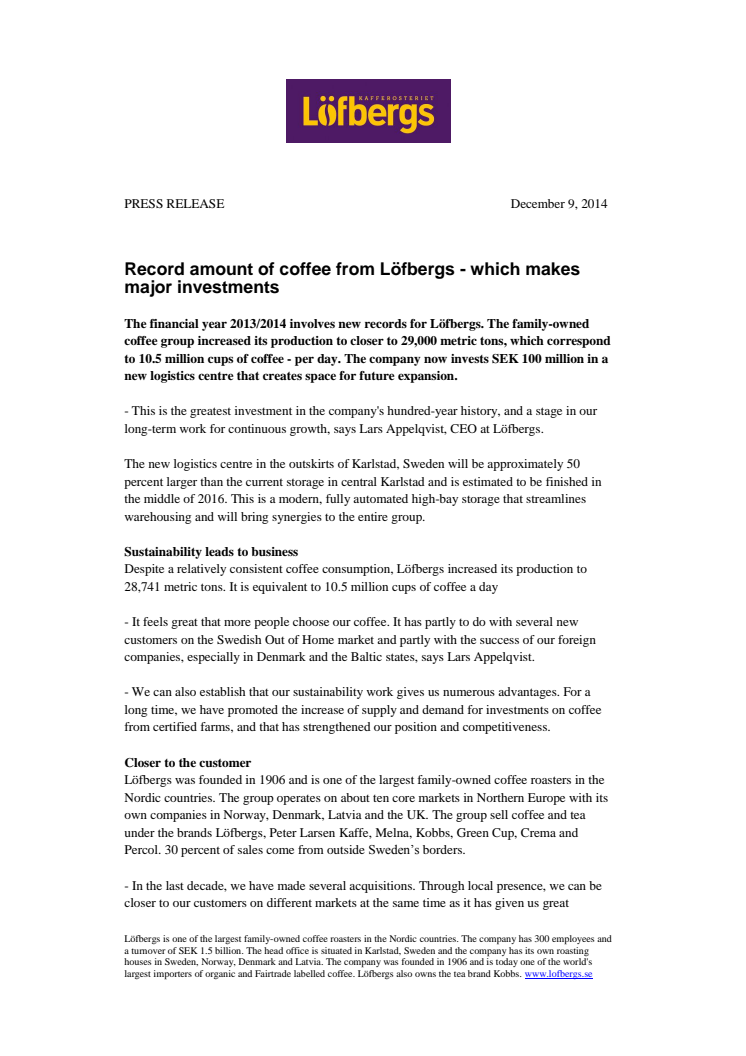 The financial year 2013/2014 involves new records for Löfbergs. The family-owned coffee group increased its production to closer to 29,000 metric tons, which correspond to 10.5 million cups of coffee - per day. The company now invests SEK 100 million in a new logistics centre that creates space for future expansion.