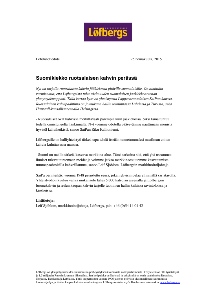 Nyt on tarjolla ruotsalaista kahvia jääkiekosta pitäville suomalaisille. On nimittäin varmistunut, että Löfbergsista tulee vielä uuden suomalaisen jääkiekkoareenan yhteystyökumppani. Tällä kertaa kyse on yhteistyöstä Lappeenrantalaisen SaiPan kanssa. Ruotsalainen kahvipaahtimo on jo mukana hallin toiminnassa Lahdessa ja Turussa, sekä Hartwall-kansallisareenalla Helsingissä.