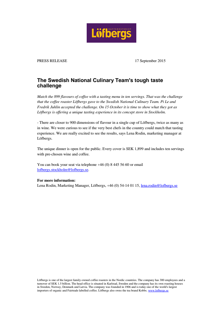 Match the 899 flavours of coffee with a tasting menu in ten servings. That was the challenge that the coffee roaster Löfbergs gave to the Swedish National Culinary Team. Pi Le and Fredrik Juhlin accepted the challenge. On 15 October it is time to show what they got as Löfbergs is offering a unique tasting experience in its concept store in Stockholm.