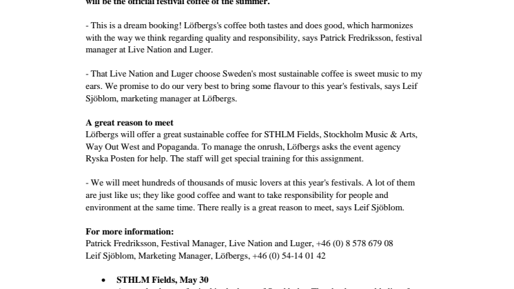 - That Live Nation and Luger choose Sweden's most sustainable coffee is sweet music to my ears. We promise to do our very best to bring some flavour to this year's festivals, says Leif Sjöblom, marketing manager at Löfbergs.