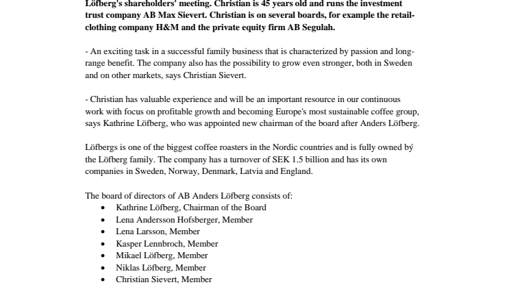 Christian Sievert was elected member of the board of directors at AB Anders Löfberg's shareholders' meeting. Christian is 45 years old and runs the investment trust company AB Max Sievert. Christian is on several boards, for example the retail-clothing company H&M and the private equity firm AB Segulah.