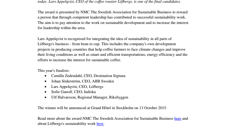 The finalists for the prestigious Swedish award Sustainable Leadership 2015 were presented today. Lars Appelqvist, CEO of the coffee roaster Löfbergs, is one of the final candidates.