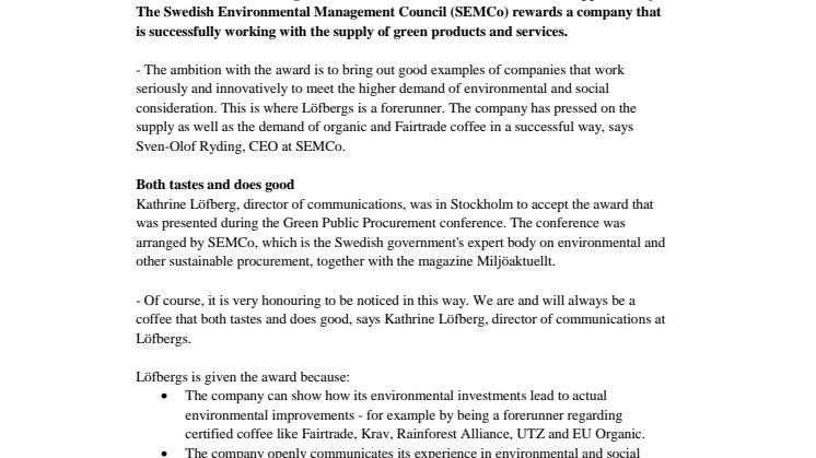 - The ambition with the award is to bring out good examples of companies that work seriously and innovatively to meet the higher demand of environmental and social consideration. This is where Löfbergs is a forerunner. The company has pressed on the supply as well as the demand of organic and Fairtrade coffee in a successful way, says Sven-Olof Ryding, CEO at SEMCo.