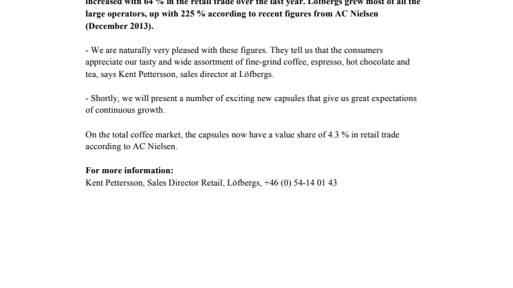 The capsule segment continues to grow strongly in Sweden. Sales of coffee capsules increased with 64 % in the retail trade over the last year. Löfbergs grew most of all the large operators, up with 225 % according to recent figures from AC Nielsen (December 2013).