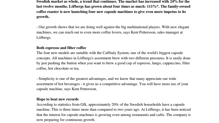 According to statistics from Gfk, approximately 20% of the Swedish households have a capsule machine. This is three times more than compared to two years ago. At Löfbergs, it has been noticed that the interest for capsule machines is growing even among restaurants and cafés. The company is now preparing for continuous growth.