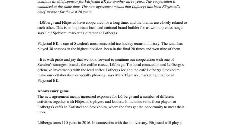 - It is with pride and joy that we look forward to continue our cooperation with one of Sweden's strongest brands, the coffee roaster Löfbergs. The local connection and Löfbergs's offensive investments with the iced coffee Löfbergs Ice and the café Löfbergs Stockholm make our collaboration especially pleasing, says Mats Tågmark, marketing director at Färjestad BK.