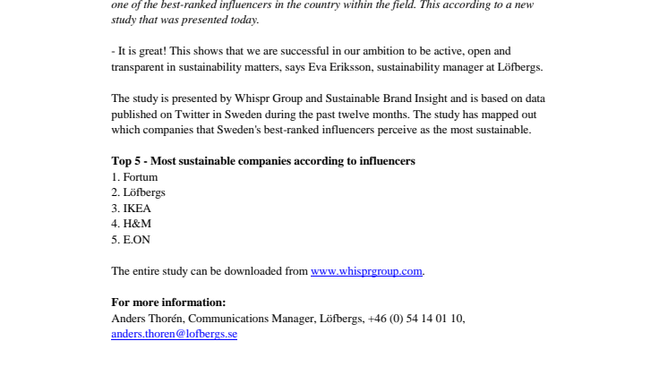The study is presented by Whispr Group and Sustainable Brand Insight and is based on data published on Twitter in Sweden during the past twelve months. The study has mapped out which companies that Sweden's best-ranked influencers perceive as the most sustainable.